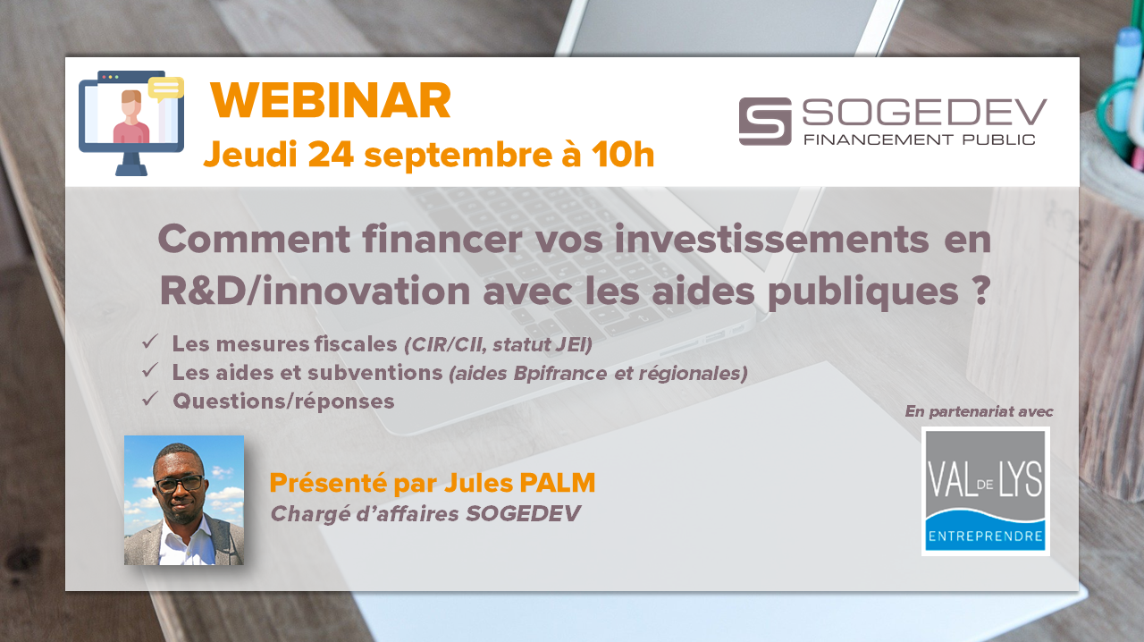 Val de Lys Entreprendre et Sogedev organisent le 24 septembre 2020 un webinar consacré aux aides publiques qui vous permettent de financer vos investissements en R&D et innovation. Inscrivez-vous dès maintenant !