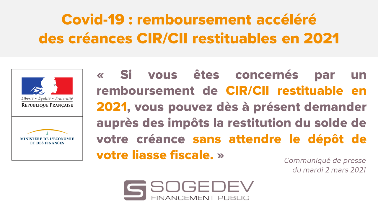 Cela signifie que, si vous êtes concernés par un remboursement de CIR/CII restituable en 2021, vous pouvez dès à présent demander auprès des impôts la restitution du solde de votre créance sans attendre le dépôt de votre liasse fiscale.