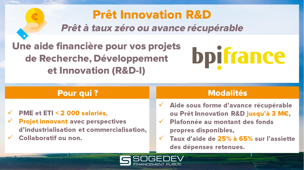 Sous forme d’avance récupérable ou de Prêt Innovation (PI) à taux zéro, Bpifrance vous propose une aide financière pour co-financer vos dépenses de Recherche et Développement (R&D) et Innovation, jusqu’à 3 millions d’euros. Sogedev vous éclaire !