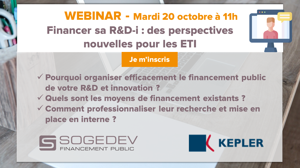 Les cabinets SOGEDEV et KEPLER s’associent pour proposer un webinar dédié aux ETI innovantes, grâce à la mise en commun de leurs expertises métiers. Rendez-vous le 20 octobre 2020 pour tout savoir sur le financement de la R&D et votre innovation !