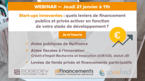 Les acteurs iii financements, Sogedev et Sowefund s’associent pour proposer un webinar dédié aux start-ups innovantes, grâce à la mise en commun de leurs expertises métiers dans l’obtention de financements publics et/ou privés. Rendez-vous le jeudi 21 janvier 2021 !