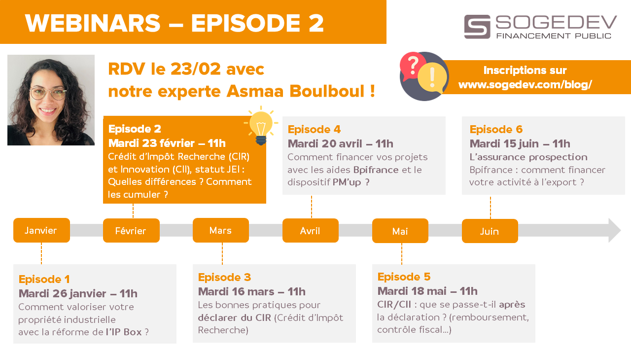 Présenté par Asmaa Boulboul (Consultante Technique Senior), le 2e épisode du mardi 23 février à 11h vous informe sur l’utilisation complémentaire du Crédit d’Impôt Recherche (CIR) et du statut Jeune Entreprise Innovante (JEI).