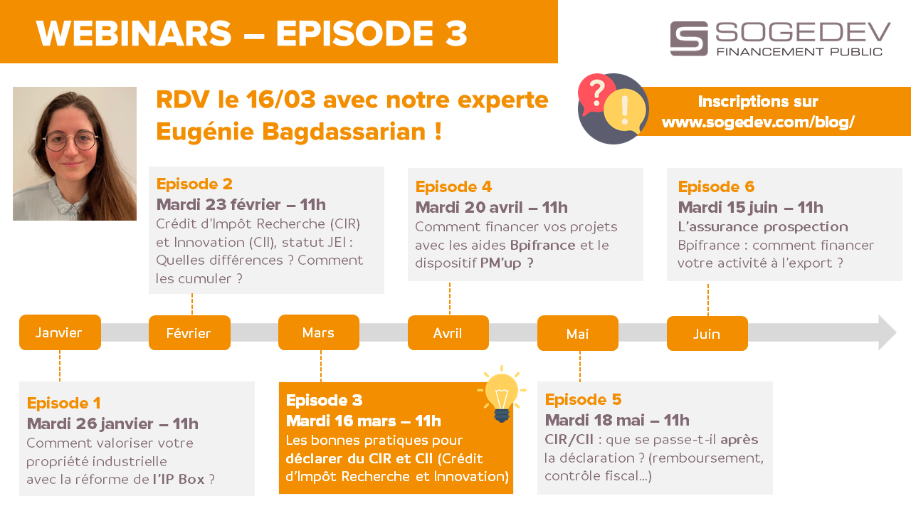 Présenté par Eugénie Bagdassarian (Consultante Technique Senior), le 3e épisode du mardi 16 mars à 11h vous informe sur les bonnes pratiques à adopter lors de votre déclaration de Crédit d’Impôt Recherche et Innovation (CIR/CII).